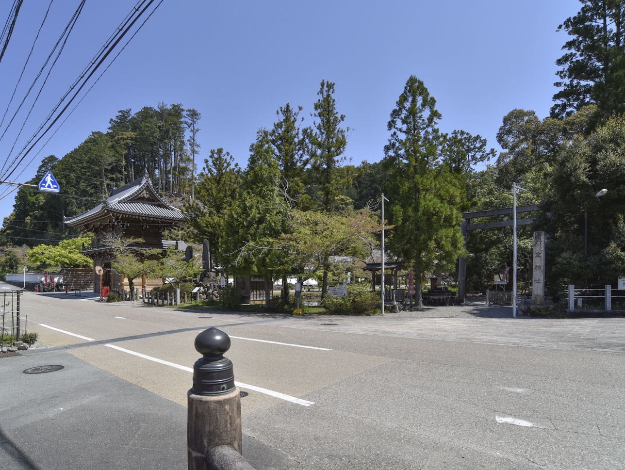 街は、この神宮寺山門の正面に広がり、今でも格子戸や土塀など妻入りの街並みや数多くの由緒ある寺院が残るなど、当時の繁栄を偲ばせています。